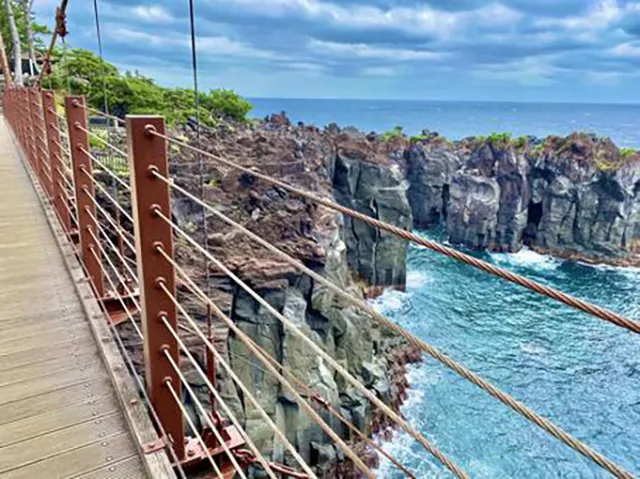 門脇吊橋は、城ヶ崎海岸の主要観光スポットで、約4000年前の大室山の噴火で形成された溶岩岩石の断崖を結ぶ。長さ48m、高さ23m、幅1.5mで、橋の下には岩礁と荒波が広がる。周辺には門脇埼灯台やピクニカルコースがあり、観光客で賑わうが、夜は静寂と波音に包まれ、心霊噂が立つ。以下に基本情報をまとめる。